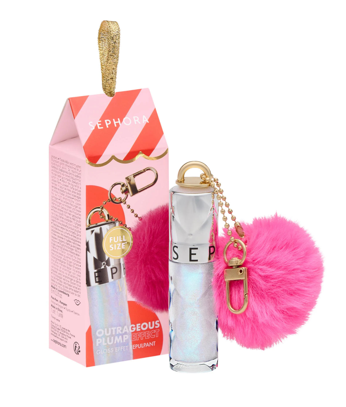 Un tono exclusivo del brillo Outrageous Plump Effect que incluye un llavero rosa para llevar a todas partes.