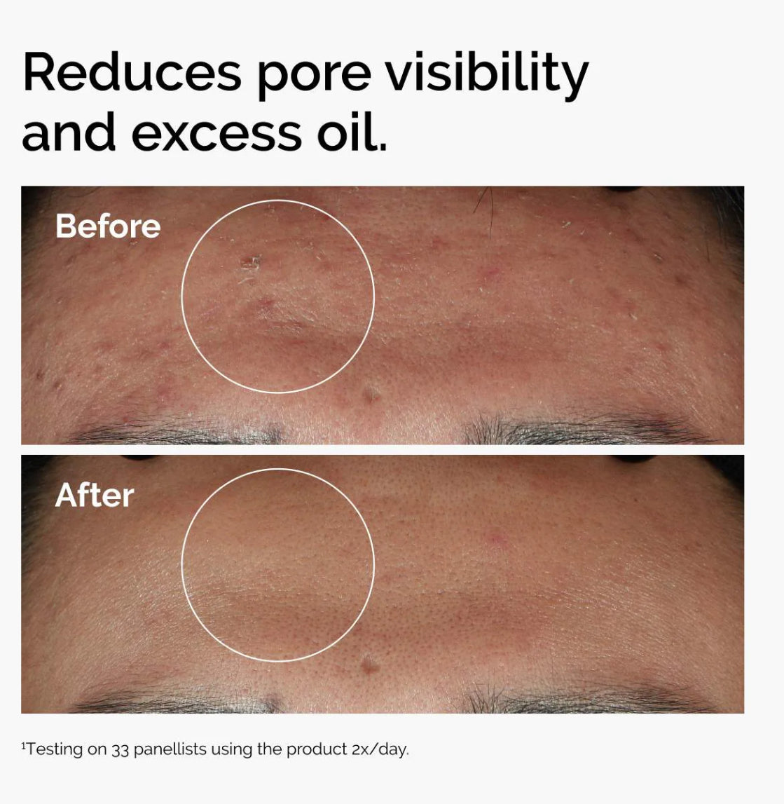 La Niacinamida, entre sus múltiples maravillas, reduce los poros dilatados, elimina las marcas del acné, previene nuevos brotes e iguala el tono de la piel. Y el Zinc,(este maravilloso mineral de los dioses), es súper importante por su poder antioxidante, porque regula las glándulas sebáceas y porque ayuda a cicatrizar el tejido.